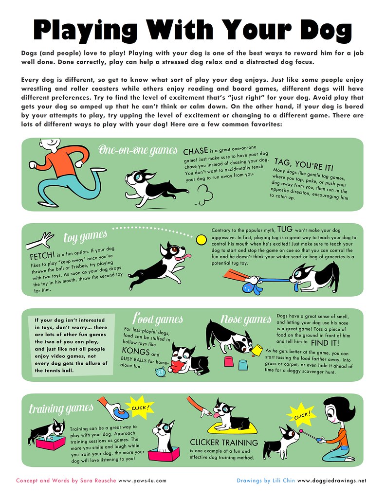 Dogs (and people) love to play! Playing with your dog is one om the best ways to reward them for a job well done. Done correctly, play can help a stressed dog relax and a distracted dog focus.
